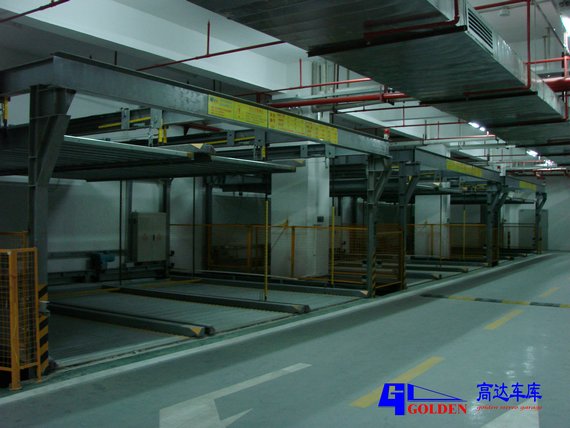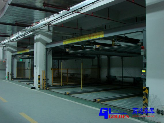 升降橫移式立體停車庫的出入口在地面層,最高層的載車板只能做升降動(dòng)作,地面層的載車板只能做橫移動(dòng)作;中間層載車板既可做升降動(dòng)作又可做橫移動(dòng)作。中間層均設(shè)有空位,車臺板通過橫移動(dòng)作變換位置,從而橫移出空位,而上層的汽車做下降動(dòng)作,從而取出汽車,地面層汽車無須運(yùn)動(dòng)便可直接開出。